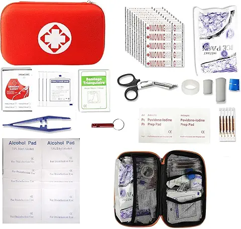 - Includes bandages, antiseptic wipes, gauze, scissors, tape, and more